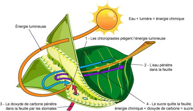 Schéma de la photosynthèse chlorophyllienne dans une feuille - SVT