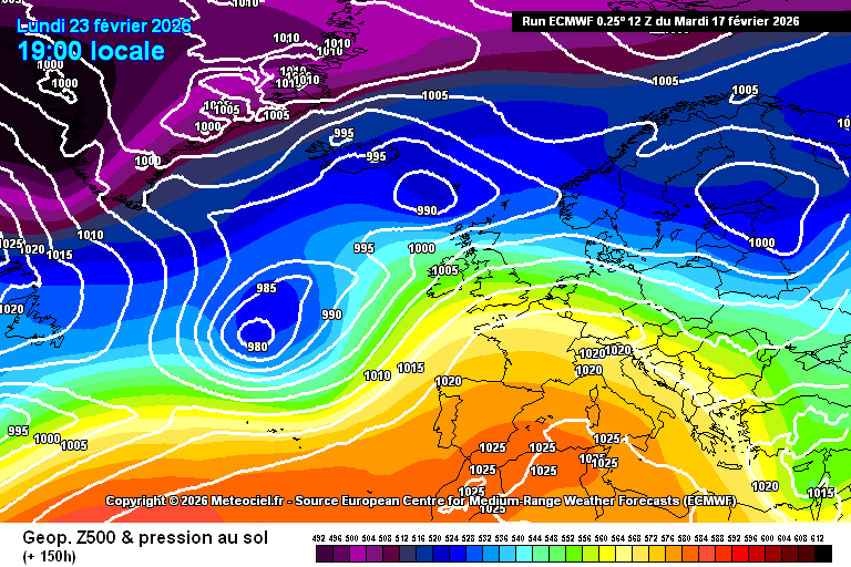 Prévision de l'évolution des anticyclones et dépressions sur l'Europe du jeudi 16 au lundi 23 février 2026 – Modèle européen via Meteociel