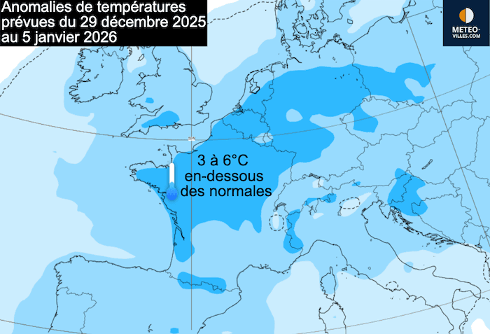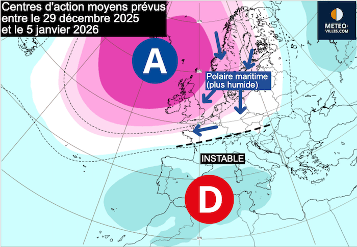 La bascule du courant vers le nord, apportant de l’air polaire plus maritime, prévue dimanche 28 ou lundi 29 décembre, précédait une descente froide potentiellement plus intense. Bien que tous les scénarios restent envisageables, y compris celui d’une vague de froid plus marquée, il semble que le temps restera froid au moins durant la première semaine de janvier. L’anticyclone scandinave devrait alors se décaler entre l’Écosse et l’Islande, laissant place à un air légèrement plus humide, mais également plus froid, car il descendrait directement de Scandinavie.