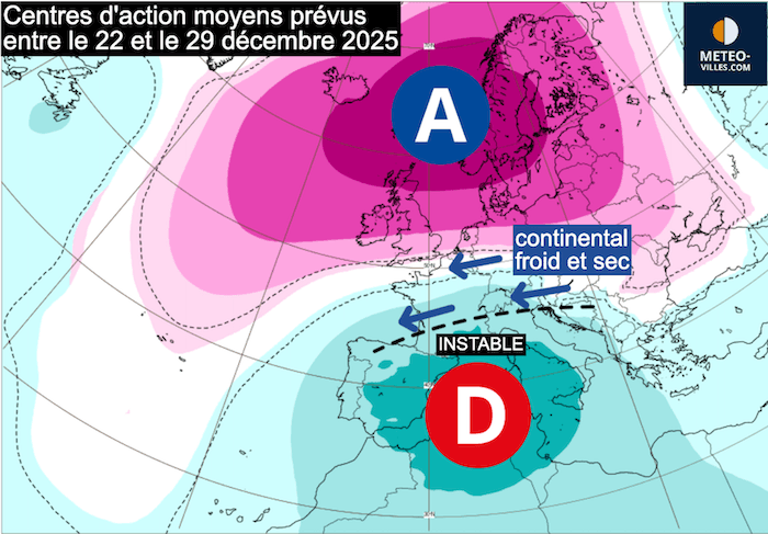Dans un premier temps, un anticyclone se formera sur les pays scandinaves, tandis qu’une dépression s’installera en Méditerranée. La France, située entre ces deux centres d’action, favorisant un vrai Moscou-Paris (courant continental, plutôt sec, mais de plus en plus froid).