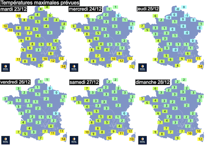 Cette journée de Noël sera particulièrement froide comparée aux températures récentes, bien que nous restions loin des records de froid pour la saison. Il est possible que les maximales des après-midi aient du mal à dépasser 0°C sur l’ensemble du Nord, du centre et de l’Est.