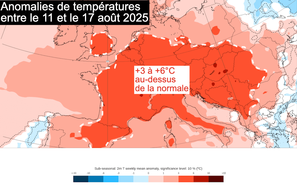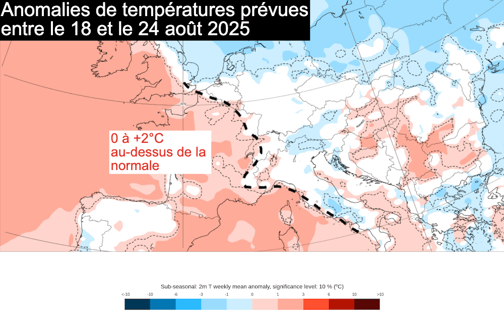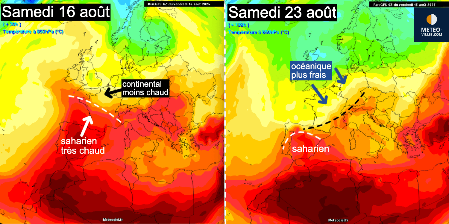 La différence de températures entre samedi 16 et samedi 23 août sera significative. Après avoir été très largement au-dessus des normales (excepté localement en Bretagne et près de la Manche), les températures vont redescendre au niveau des moyennes de saison. Certaines villes pourraient même connaître des températures inférieures aux normales durant quelques journées de la semaine prochaine !