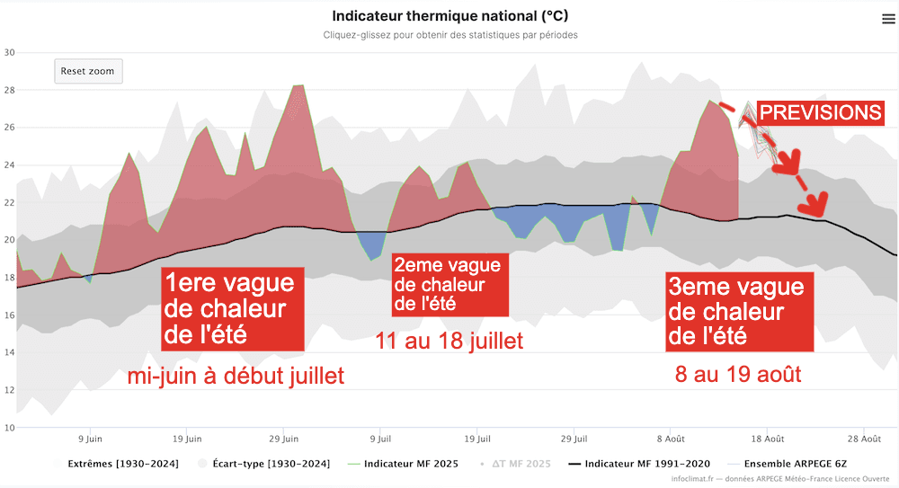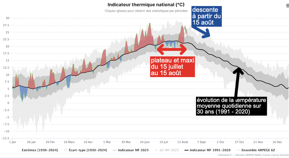 Heureusement, la fin est en vue. Nous arrivons au terme de l’été, et après un plateau généralement atteint entre le 15 juillet et le 15 août, la température moyenne quotidienne au niveau national commence à baisser à partir du 15 août.