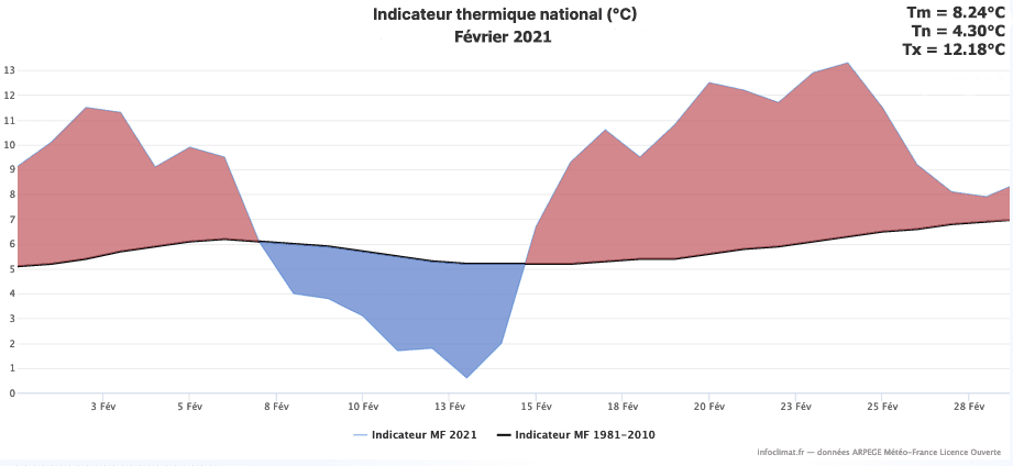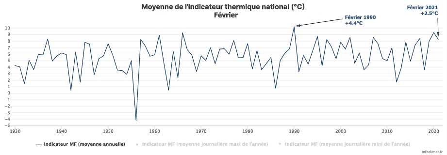 Au final, c'est bel et bien la douceur qui a fortement pesé dans la balance. Avec un indicateur thermique national de 8.24°C, ce mois de février 2021 se boucle sur une anomalie fortement positive de +2.5°C par rapport à la moyenne 1981-2010 (+2.2°C par rapport à la période 1991-2020), soit autour du 10e rang des plus chauds depuis 1900. A l'échelle nationale, nous étions loin du podium constitué de février 1966 (+3.5°C), février 2020 (+3.6°C) et surtout du record : février 1990 (+4.4°C, indicateur thermique ayant atteint 10.18°C).