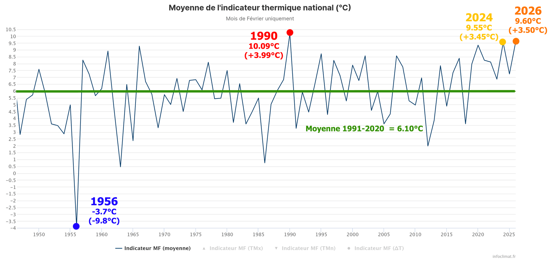 Moyenne de l'indicateur thermique national en février depuis 1946 - Infoclimat
