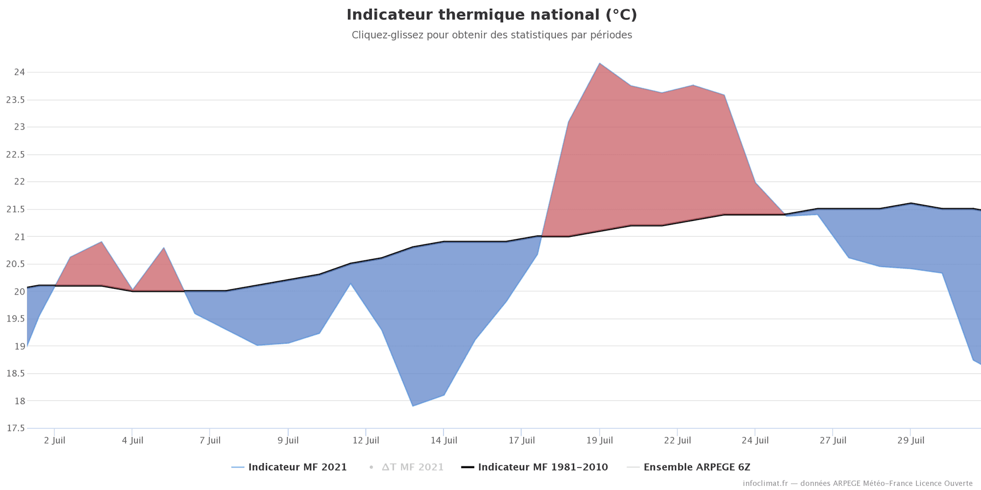 Au regard des futures moyennes climatiques de la période 1991-2020 qui seront effectives en début d’année prochaine, le bilan est toutefois moins clément avec une anomalie se creusant à -0.5°C. Ceci s’explique par une récurrence forte d’étés particulièrement chauds ces dernières années, ayant fait augmenter ces moyennes saisonnières… et troublant donc notre ressenti sur cet été en cours. De ce fait, ce mois de juillet 2021 peu ou prou « dans les normes » est pourtant le plus frais depuis juillet 2014 !
