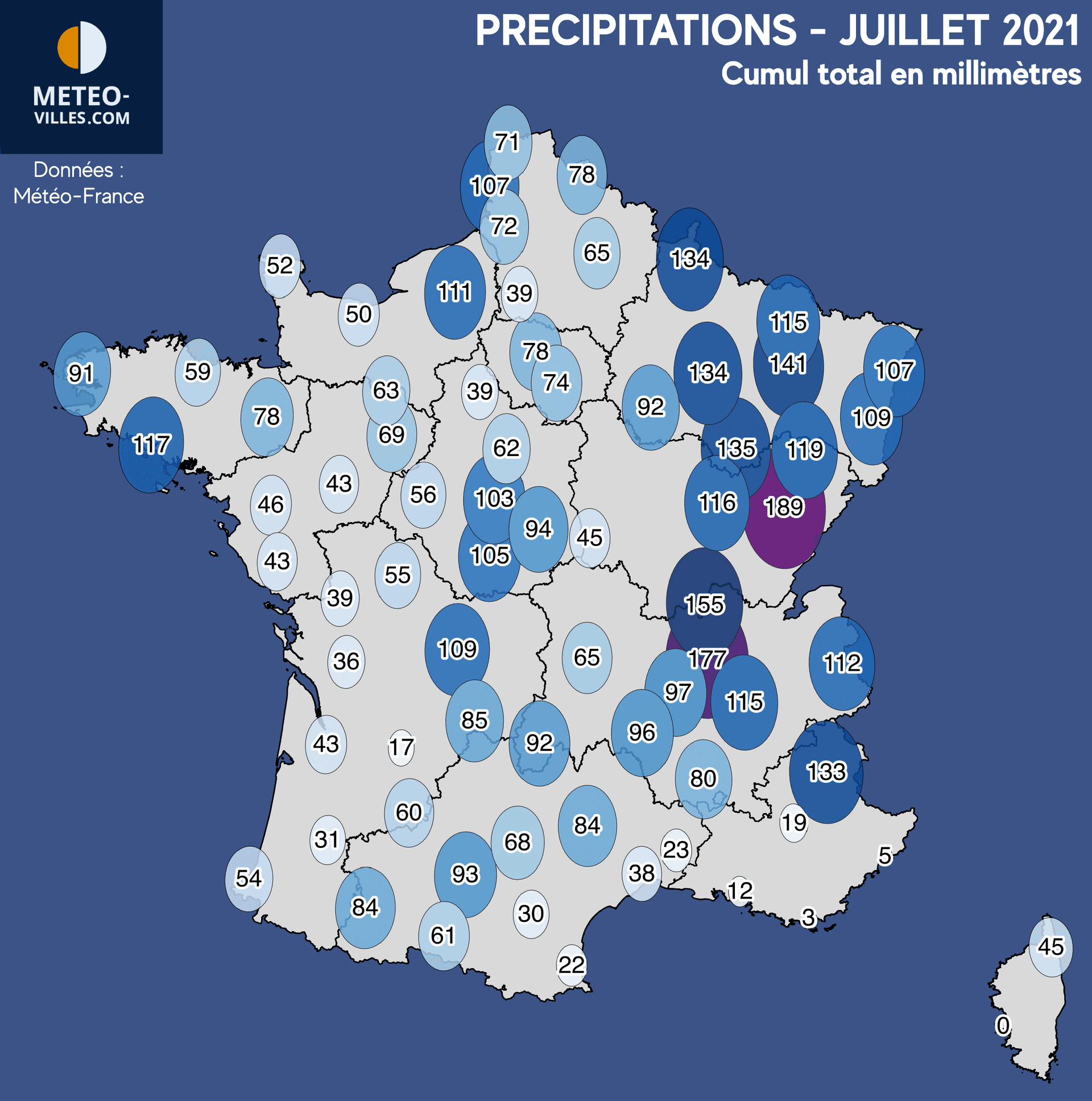 C’est dans l’Est de la France ainsi qu’en Occitanie où les pluies ont été anormalement abondantes, avec des cumuls dépassant parfois deux fois la moyenne mensuelle (anomalie supérieure à +100%) : +109% à Lorient, +110% à Besançon, +112% à Millau, +119% à Mâcon, +126% à Nancy, +132% à Montpellier, +145% à Toulouse, +178% à Lyon-Bron, +184% à Embrun, et même jusqu’à +256% à Bastia (soit 3,5 fois plus qu’un mois de juillet normal).