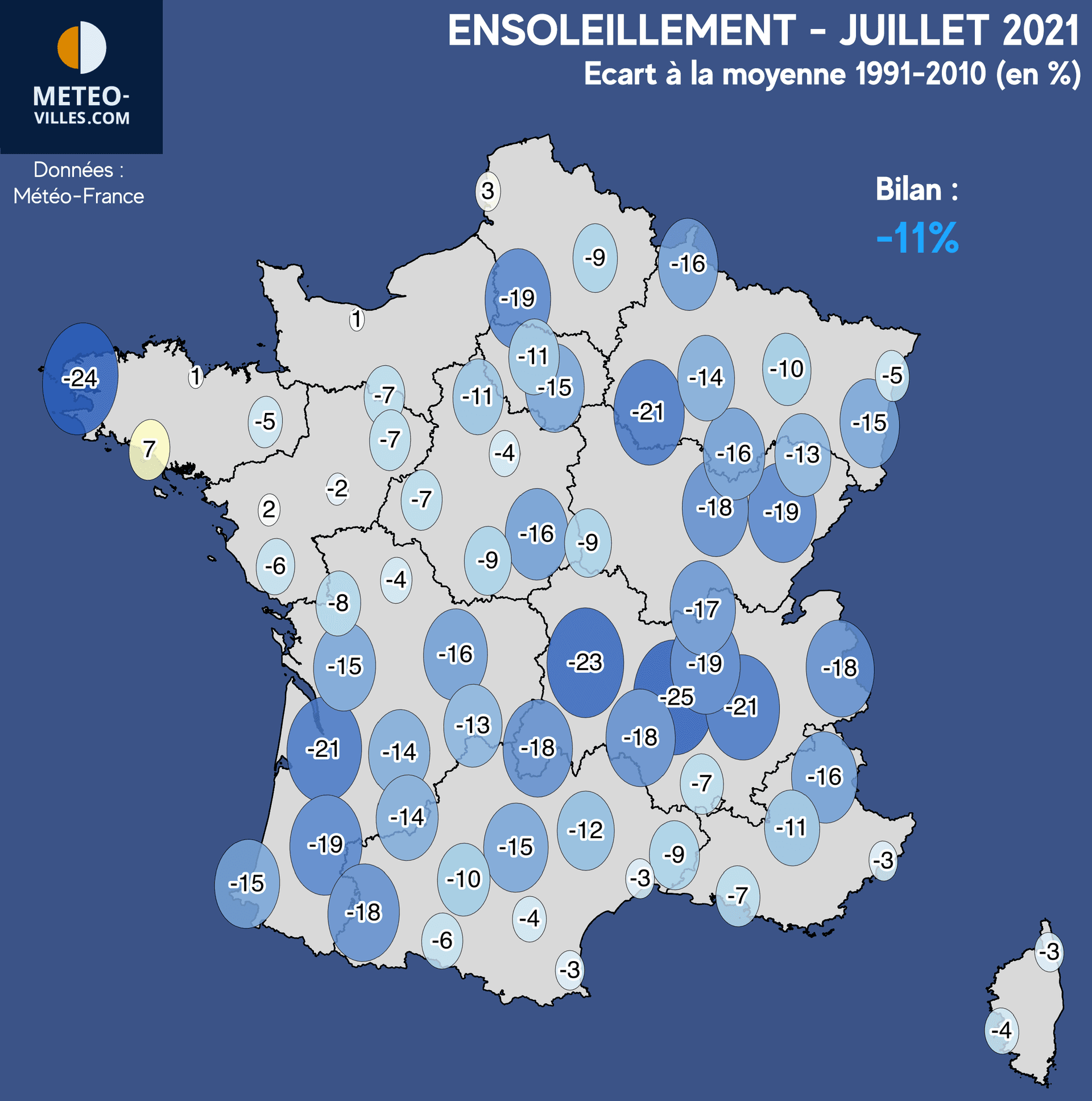 Malgré les fréquentes pluies, l’ensoleillement avait été conforme aux moyennes au cours du mois de juin… or, ce n’était pas le cas pour ce mois de juillet, décidément bien maussade. En effet, outre les pluies, le soleil s’est fait plutôt discret : sur notre panel, le déficit d’ensoleillement a atteint -11% à l’échelle nationale au cours de ce mois de juillet 2021.