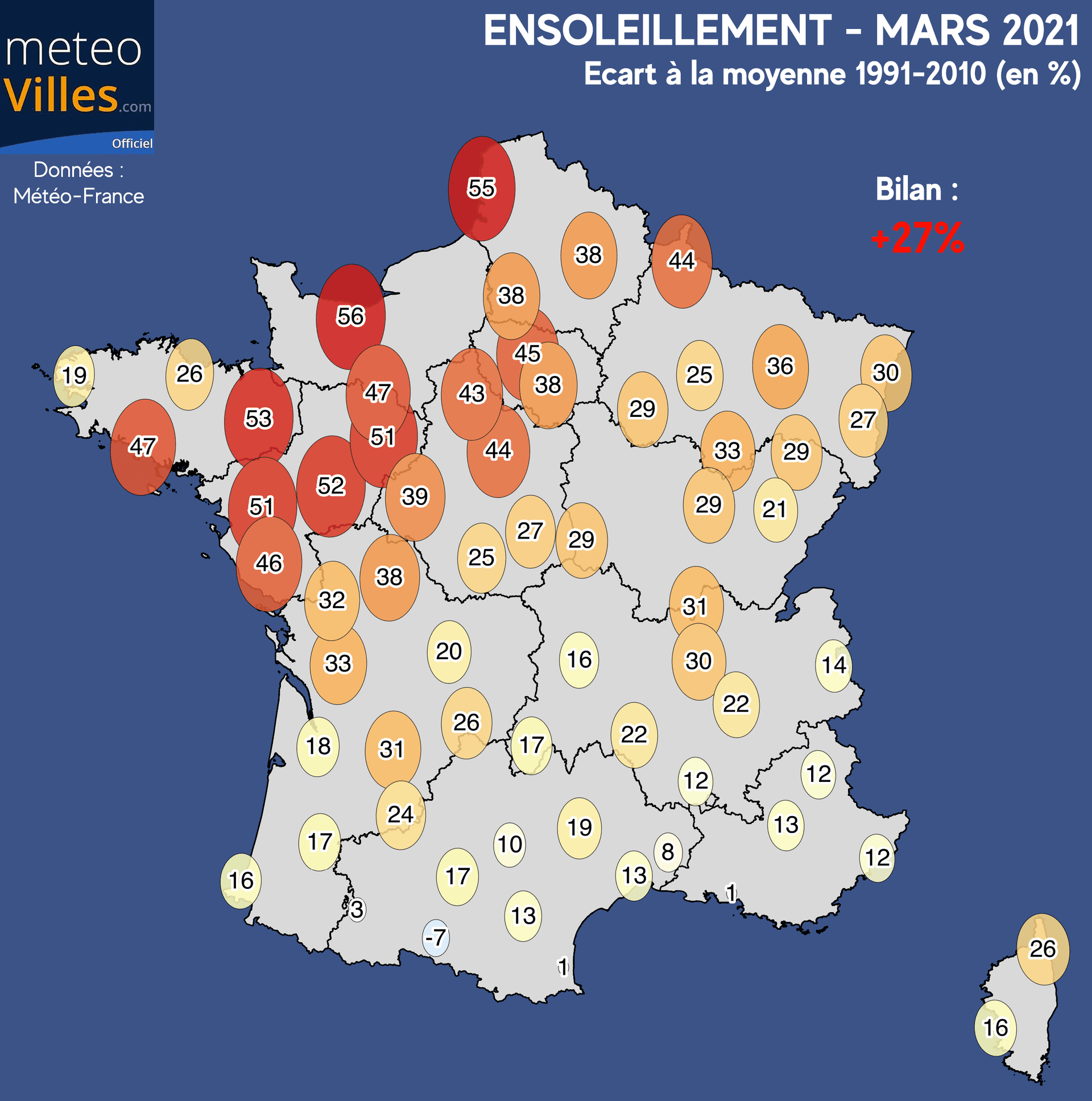 Dans la moitié Nord, l'excédent y dépasse de manière quasi-généralisée les +30%. Mais c'est dans le quart Nord-Ouest où le mois écoulé a été bien plus remarquablement lumineux qu'à l'accoutumée, avec +40% voire même +50% d'excédent entre les Pays de la Loire et les Hauts-de-France, en passant par la Normandie, l'Ile-de-France ainsi que l'Est de la Bretagne (+51% au Mans et à Nantes, +52% à Angers, +53% à Rennes, +55% au Touquet et jusqu'à +56% à Caen). Pour Paris, l'excédent a atteint +45% au parc Montsouris.