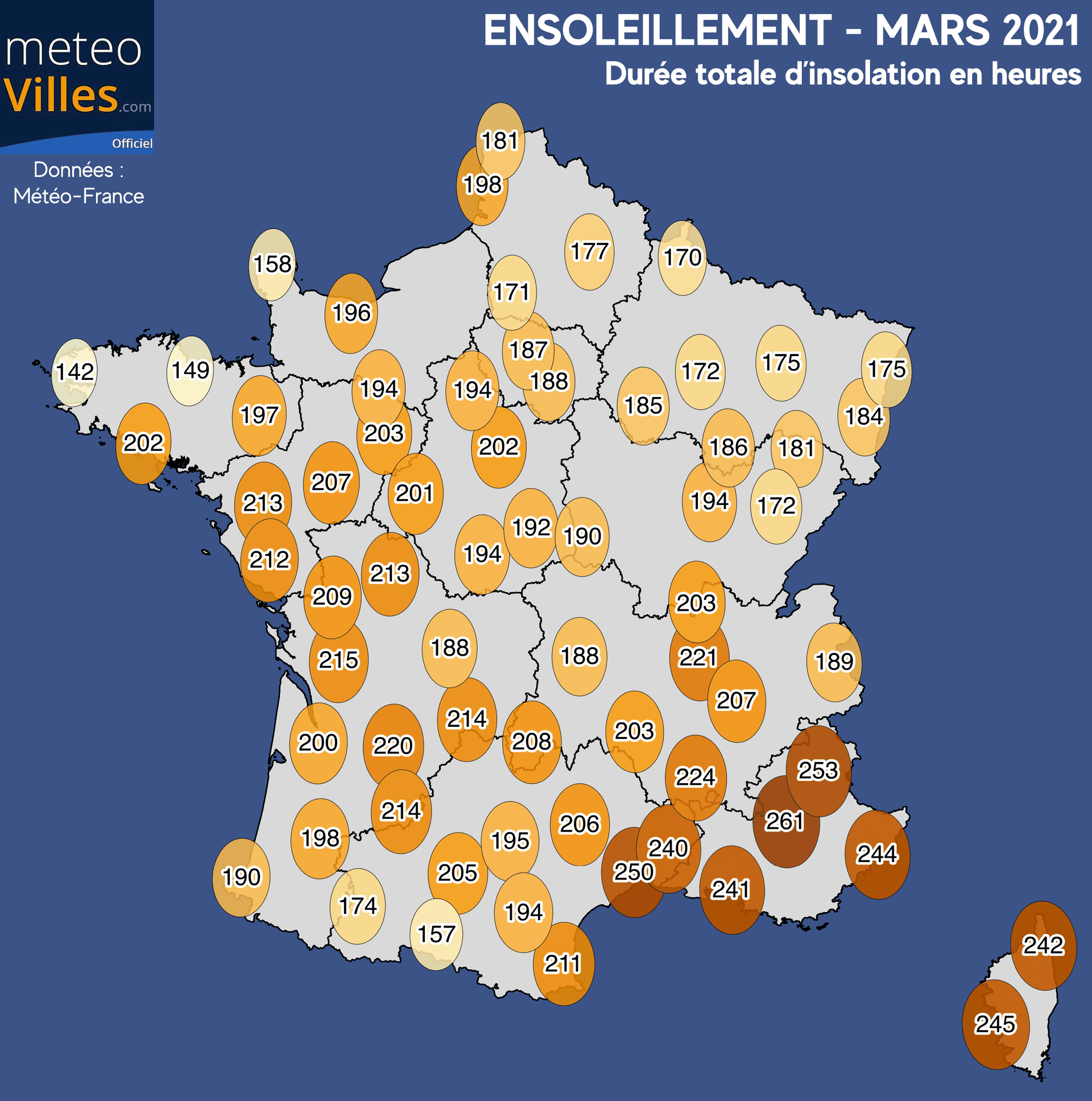 Malgré un écart à la moyenne moins marqué que sur la moitié Nord, les régions Méditerranéennes ont, comme la plupart du temps, pu profiter le plus longtemps du soleil au cours de ce mois de mars avec plus de 240 heures cumulés (jusqu'à 250h à Montpellier, 253h à Embrun et même 261h à Saint-Auban pour le maximum de notre panel).