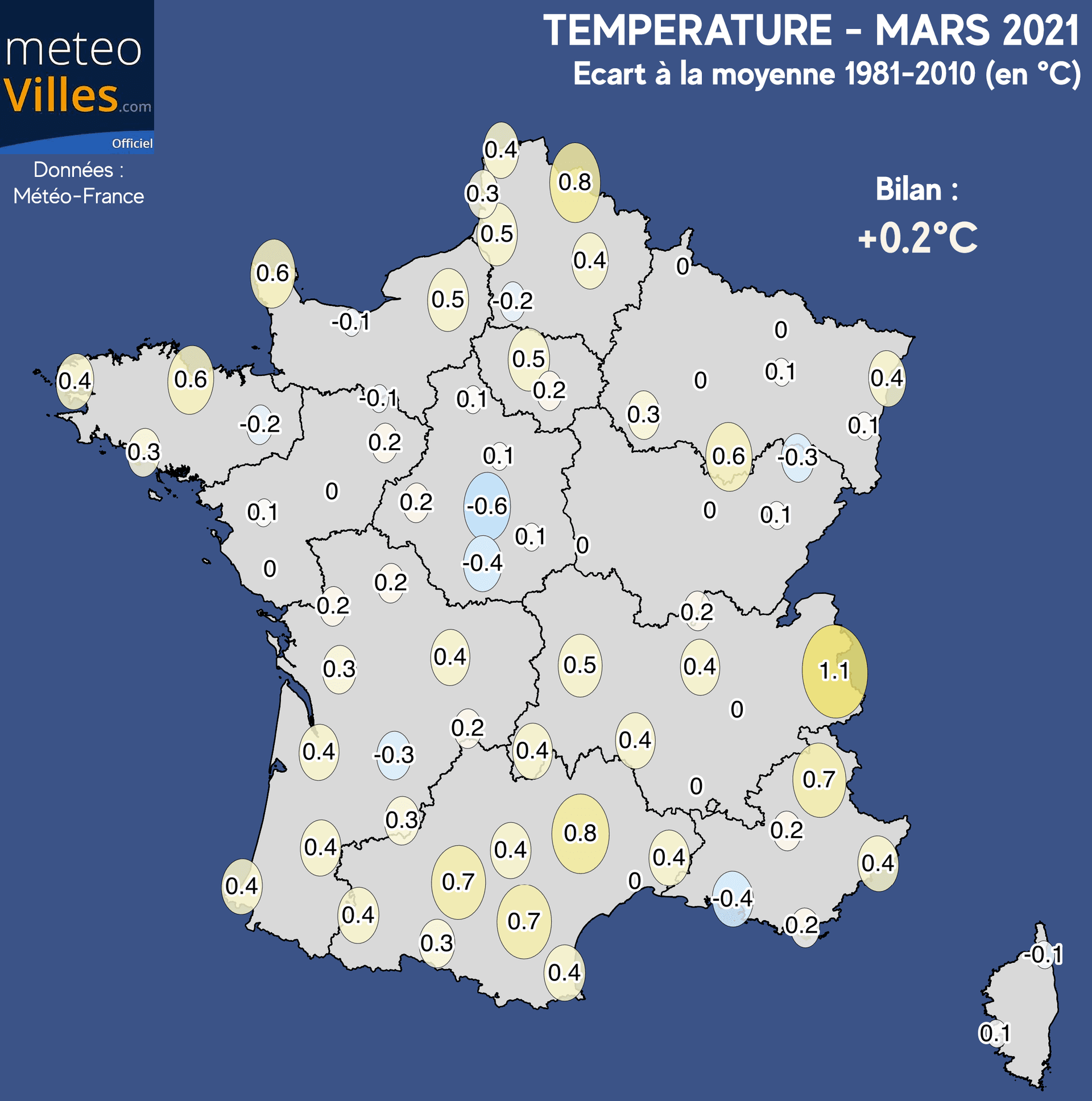 Comme à chaque début de mois, nous vous proposons un bilan climatologique du mois écoulé. Place donc au bilan cartographié du mois de MARS 2021 en termes de température, pluviométrie et ensoleillement sur un panel de 73 stations*.