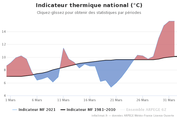 Mars est le premier mois du printemps météorologique, et est le théâtre des premières journées de grande douceur. Pour beaucoup, nous retiendrons alors de ce mois de mars 2021 l’exceptionnelle douceur voire la véritable bouffée de chaleur estivale qui a touché le pays à partir du 29, avec des records pour plus du tiers des stations métropolitaines (jusqu’à 29.9°C dans les Pyrénées-Atlantiques >>).