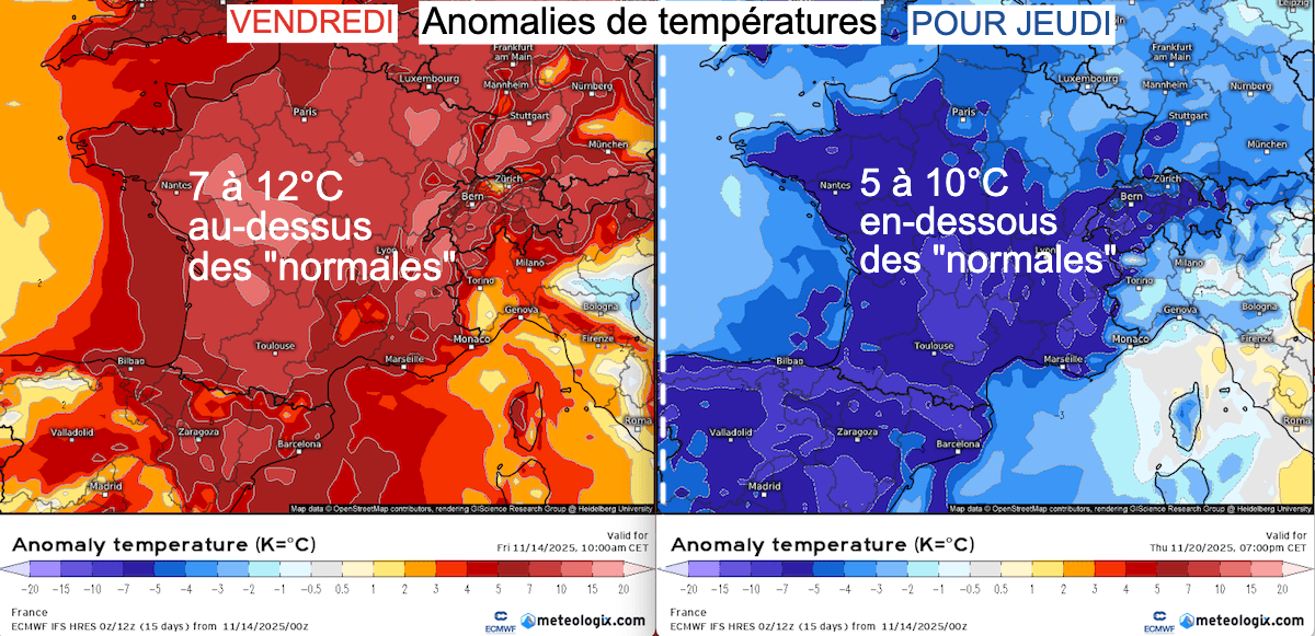 Vendredi en fin de matinée, il faisait de 7 à 12°C au-dessus des moyennes de saison. Et avec le changement de régime prévu dans les prochains jours (notamment à partir de lundi), nous allons repasser en-dessous des normales, et même très largement! Les journées les plus froides de la semaine seront probablement celles de jeudi et vendredi où les températures seront généralement situées entre 5 et 10°C en-dessous des moyennes de saison. En revanche, les records de froid pour une fin novembre ne devraient pas être battus car cette situation est assez classique en cette saison.