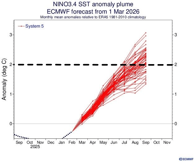 Si El Niño se caractérise par une augmentation d'environ +0,8°C des eaux du Pacifique Équatorial, un Super El Niño se caractérise quant à lui par une anomalie d'au moins +2°C dans cette région du globe, ce qu'envisage bon nombre de scénarios du modèle saisonnier européen d'ici l'automne.