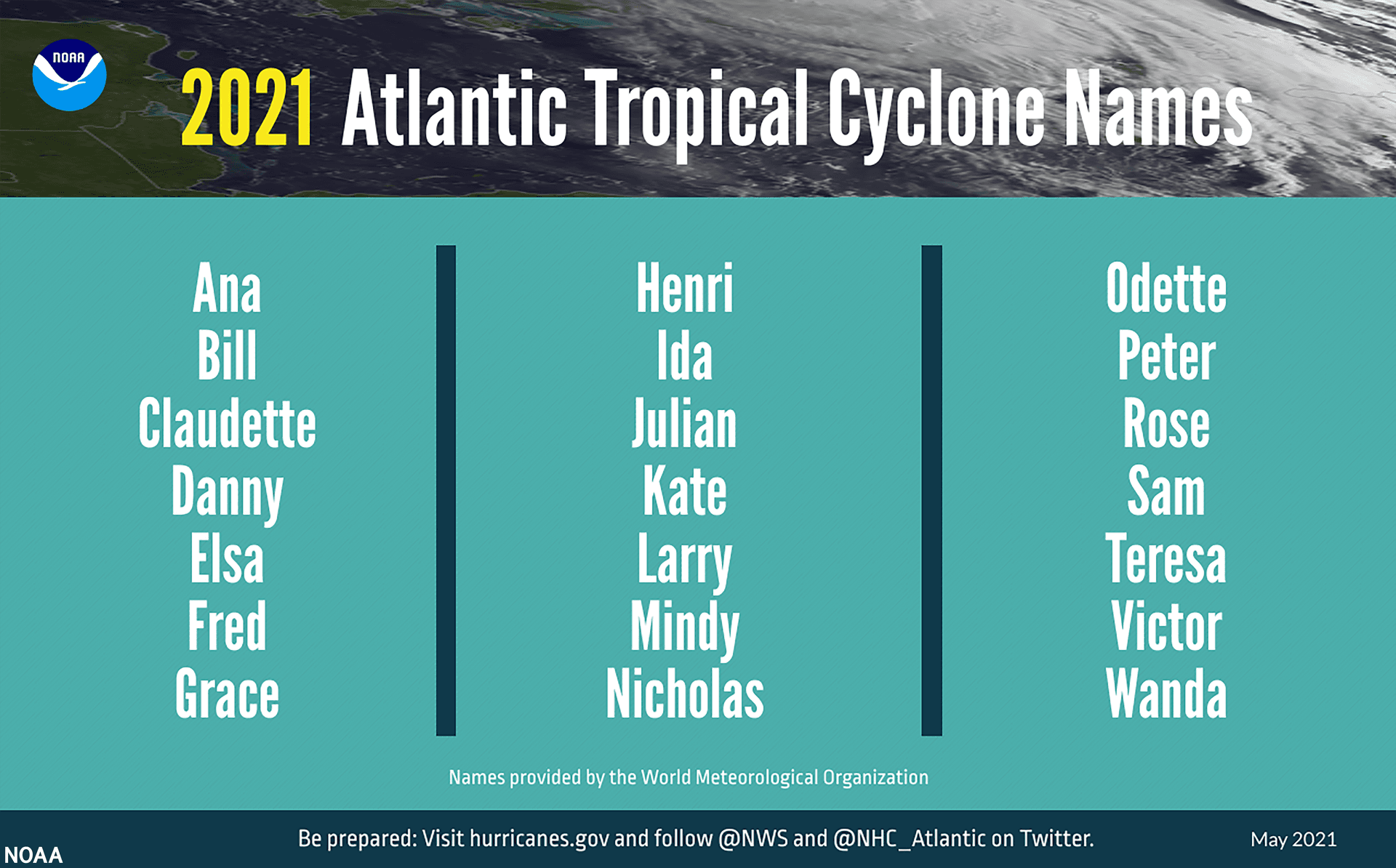 Nom des systèmes cycloniques tropicaux de l'Atlantique Nord pour la saison 2021 - NOAA