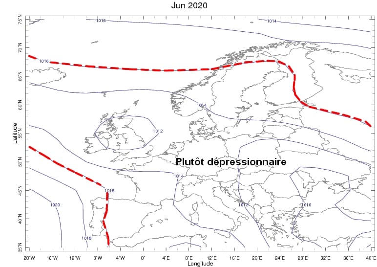 Pressions moyennes sur l'Ouest de l'Europe durant le mois de Juin 2020 - Via NOAA