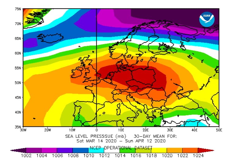 Pressions moyennes sur la période allant du 14 mars au 12 avril 2020 - via NOAA