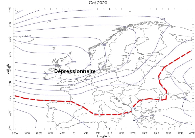 Pressions moyennes sur l'Ouest de l'Europe durant le mois d'Octobre 2020 - Via NOAA