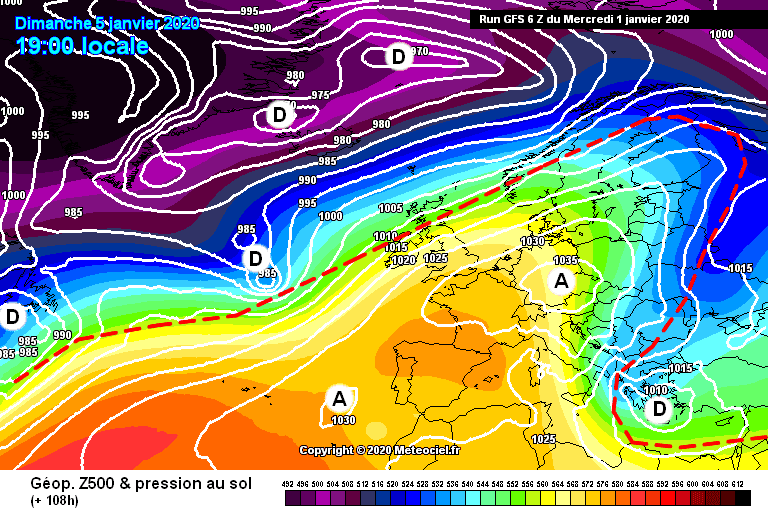 Situation atmosphérique sur l'Ouest de l'Europe le 5 Janvier 2020 - Modèle GFS via météociel.fr