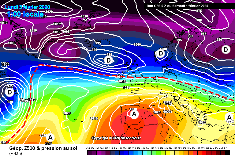 Situation atmosphérique sur l'Ouest de l'Europe le 3 février 2020 - Modèle GFS via météociel.fr