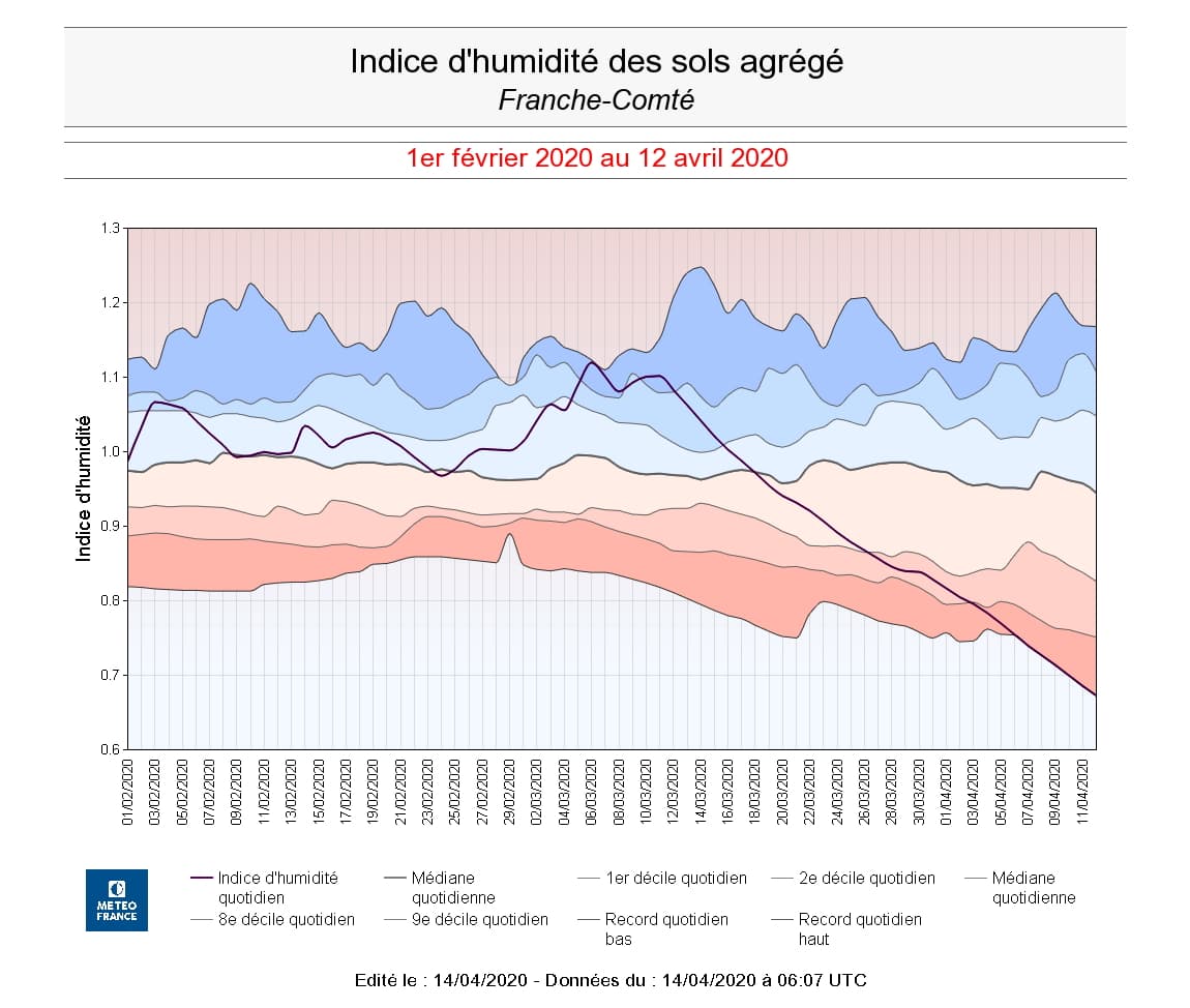 Évolution de l'indice d'humidité des sols en Franche-Comté du 1er février au 12 avril 2020 - Météo France
