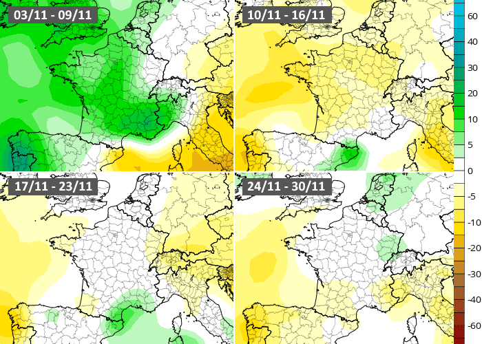 Selon le modèle européen, la première décade du mois de novembre 2025 sera globalement humide en France. Même si quelques journées calmes sont prévues, les perturbations pluvieuses devraient être multiples au cours de cette dernière, concernant la plupart des régions. En revanche, le modèle mise sur un retrait de l'instabilité dès le début de la deuxième décade du mois et envisage même une petite anomalie sèche durant la seconde partie de novembre 2025. Les hautes pressions pourraient donc reprendre le dessus.