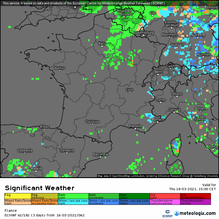 Nature des précipitations les jeudi 18 et vendredi 19 mars 2021 (vert = pluie, orange = pluie/neige, bleu = neige) - via meteologix