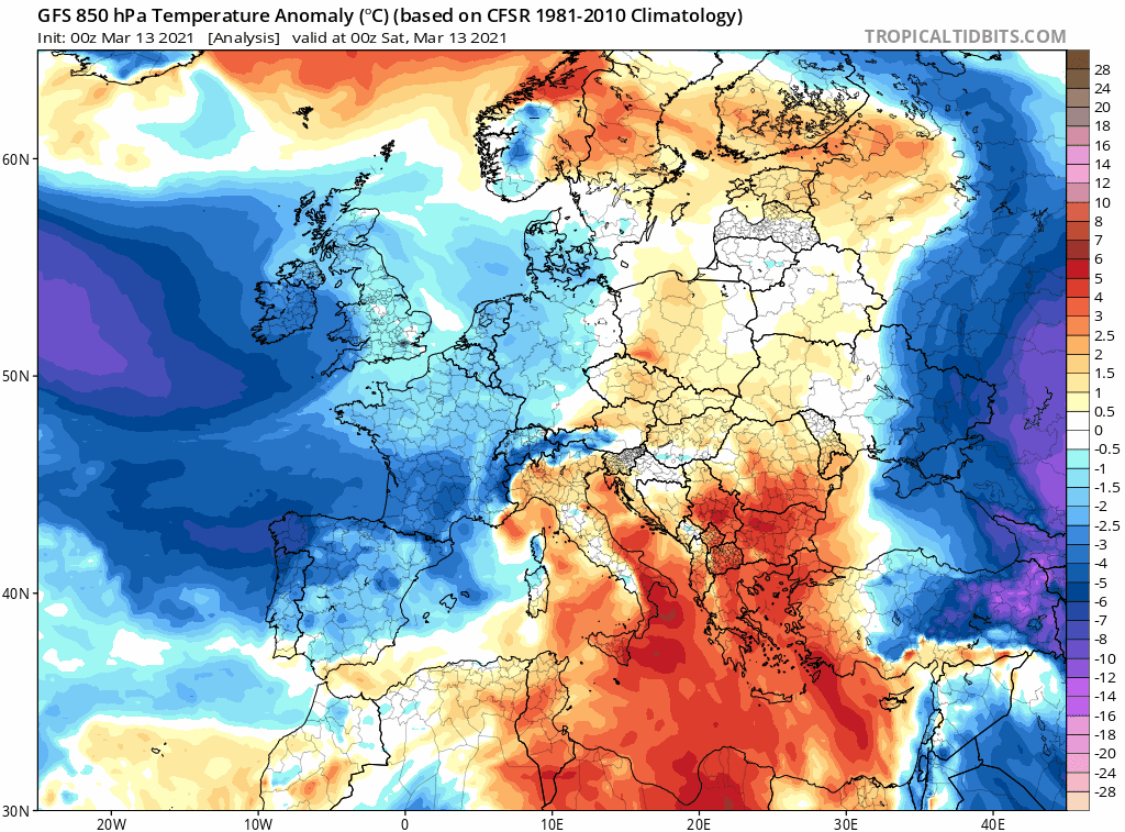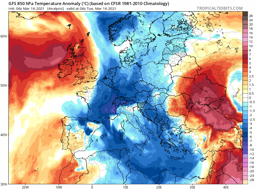 Anomalies thermiques de la masse d'air du samedi 13 au mardi 16 mars 2021 - via tropicaltidbits.com