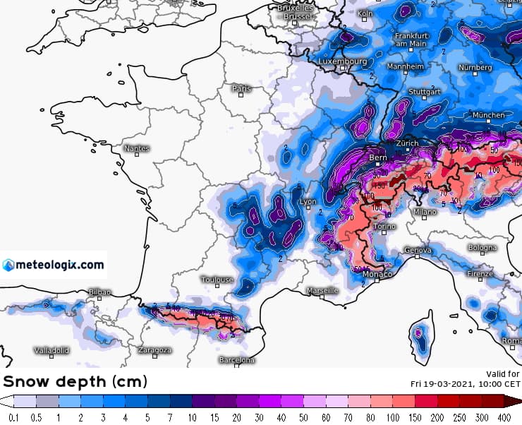 Couche de neige au sol modélisée le vendredi 19 mars 2021 en matinée - via meteologix
