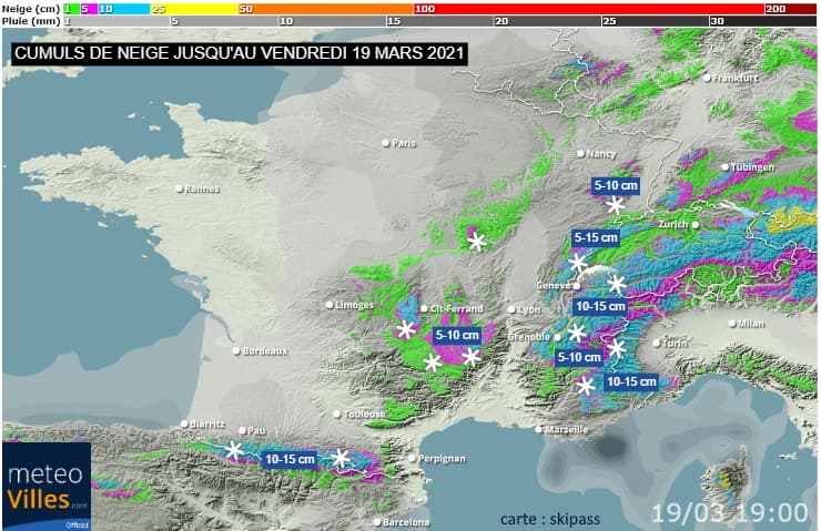 Cumuls de neige attendus sur les reliefs du mercredi 17 au vendredi 19 mars 2021 - Météo Villes via Skipass