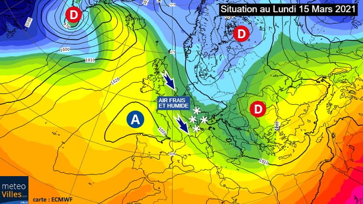 Situation à échelle continentale le lundi 15 mars 2021 - via ECMWF