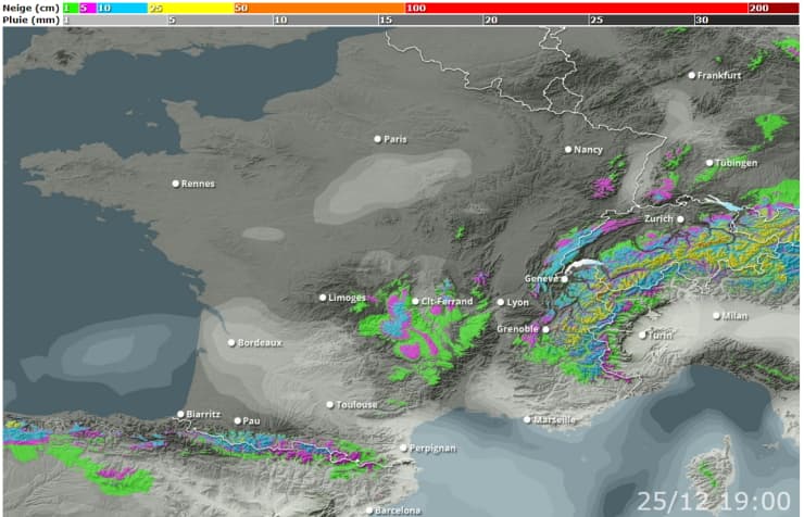 Prévisions des cumuls de neige jusqu'au vendredi 25 décembre 2020 - via skipass
