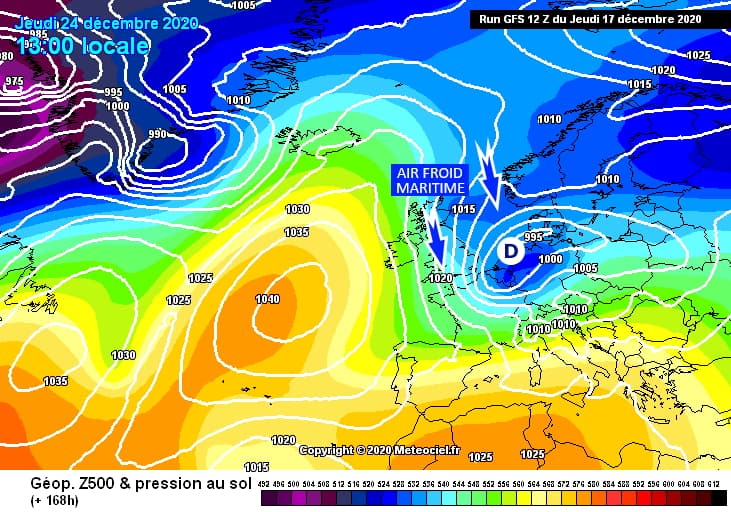 Modélisation de la situation à échelle continentale pour le jeudi 24 décembre 2020 - modèle GFS via meteociel.fr