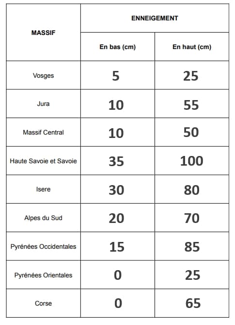 - à 1000 mètres : 30 cm dans le Beaufortain, 20 cm en Haute-Savoie, 10 à 15 cm ailleurs (5 cm entre Oisans et Grandes-Rousses)