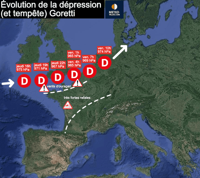 Le conflit de masse d’air va entraîner le développement rapide d’une dépression nommée Goretti. Cette dernière sera propulsée à grande vitesse par ce puissant courant d'altitude entre le sud de l’Irlande et le sud de l’Angleterre jeudi après-midi et soirée. Son intensité maximale sera atteinte en arrivant sur les Flandres françaises et belges dans la nuit de vendredi, avec une pression barométrique estimée à 965-970 hPa et un gradient de pression très resserré le long des côtes de la Manche et du Nord-Pas-de-Calais.