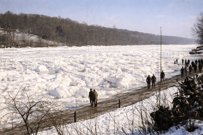 La Seine totalement gelée près de Melun (77) durant la vague de froid février 1956 - Chronique Météo Villes