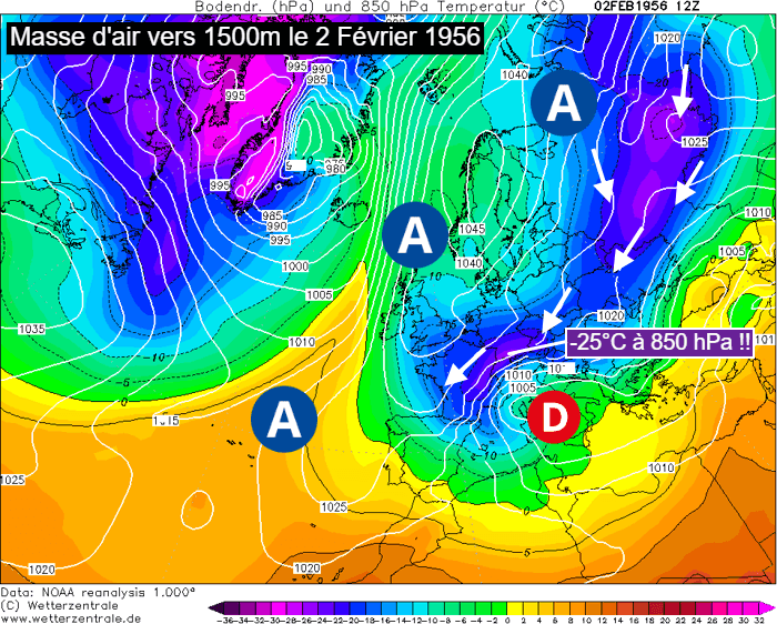 Masse d'air à 850 hPa (vers 1500m) le 2 février 1956 - wetterzentrale.de