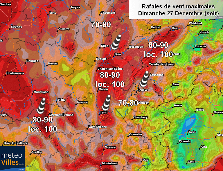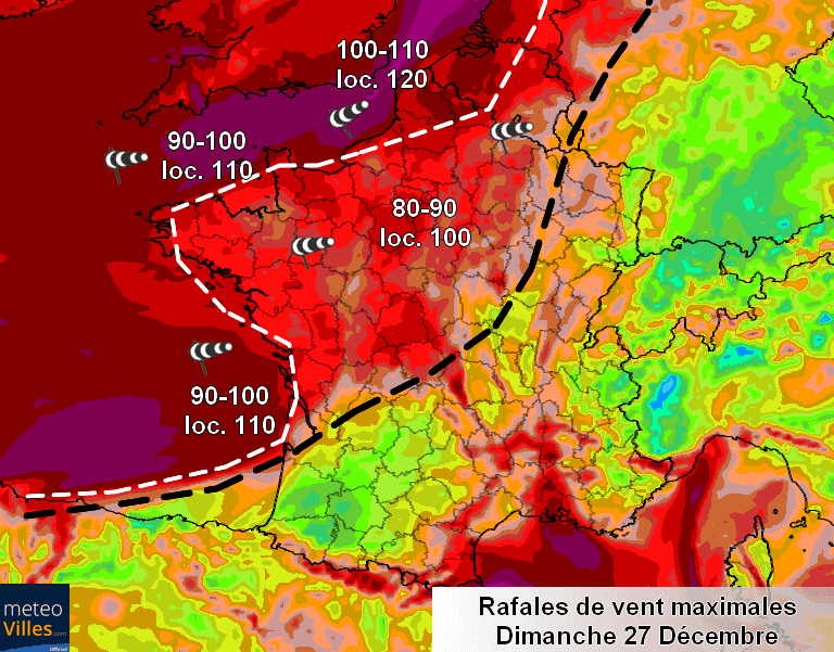 Rafales de vent maximales prévues en journée du dimanche 27 décembre – Modèle Arpège via météociel.fr