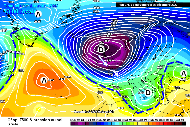Schéma de la situation atmosphérique sur l’Ouest de l’Europe pour le dimanche 27 décembre – Modèle GFS via météociel.fr