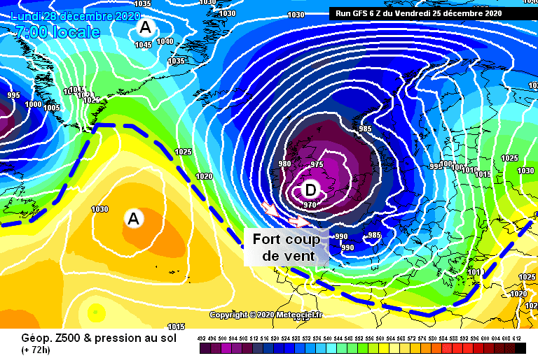 Schéma de la situation atmosphérique sur l’Ouest de l’Europe pour le lundi 28 décembre – Modèle GFS via météociel.fr