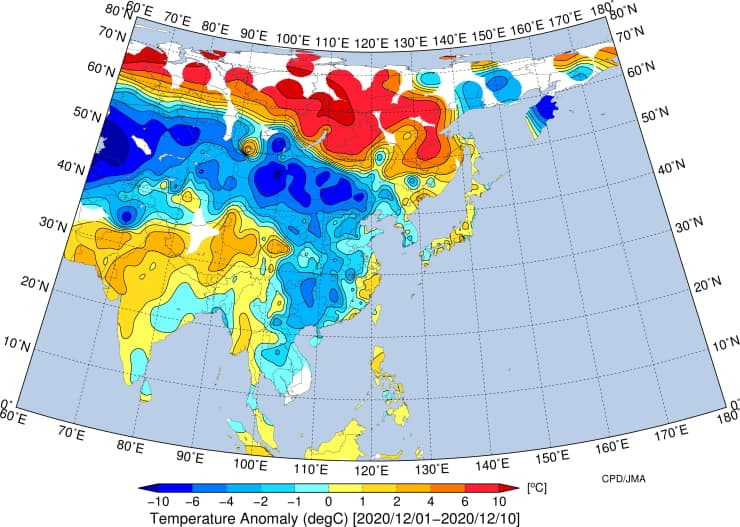 Anomalies thermiques en Asie en première décade de décembre 2020 - via JMA