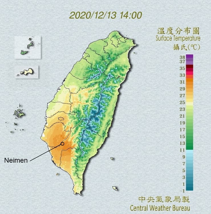 Ce lundi 13 décembre 2020, Taïwan a égalé son record mensuel de chaleur. On a relevé une température maximale de 32,9°C à Neimen. L'année 2020 fut remarquablement chaude à Taïwan qui a battu son record de chaleur national au cours de 3 des 12 mois de l'année (record absolu en juillet).