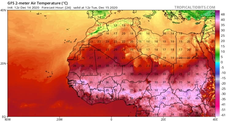 Températures maximales dans le nord de l'Afrique ce mardi 15 décembre 2020 - via tropicaltidbits.com