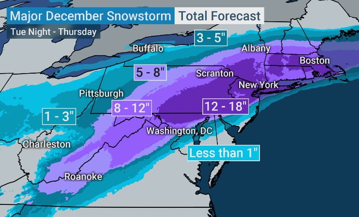 Le nord-est des États-Unis se prépare à une tempête de neige importante au cours des prochaines heures. D'ici jeudi 18 décembre 2020, un épais manteau neigeux est attendu de la Virginie jusqu'au Massachusetts. Des quantités importantes sont prévues sur des grandes agglomérations telles de New-York et Boston où les prévisions s'attendent à des cumuls proches de 30 centimètres. Il s'agira sur ces zones de la première tempête hivernale majeure.
