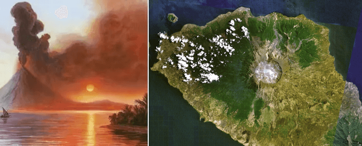 Représentation de l'éruption du Tambora en 1815 et photo récente du volcan - via Frederic Church
