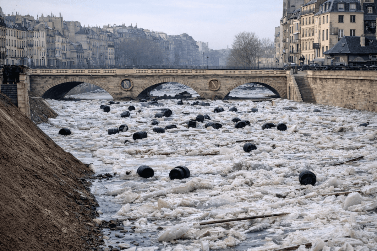Le mois de décembre 1879 fut absolument glacial en France ! Sous l'effet d'un anticyclone centré des Îles Britanniques à la Scandinavie, un flux continental domine la quasi-totalité du mois. Les relevés de la station de Paris-Montsouris notent une température minimale moyenne de -10,4°C (soit 14°C sous les normales modernes) et une moyenne des maximales de -2,7°C avec 24 jours sans dégel sur 31 ! Les fleuves français se figent alors dans la glace. Problème : un redoux spectaculaire survient à la toute fin décembre et début janvier 1880.