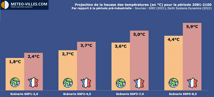 Les modèles climatiques sont unanimes sur une poursuite de cette hausse rapide d'ici à la fin du siècle. Ils confirment aussi que ce réchauffement sera plus important sur notre pays qu'en moyenne sur Terre, et ce quel que soit le scénario. En effet, que l'on retienne le scénario le plus optimiste (SSP1-2,6), intermédiaire (SSP2-4,5), pessimiste (SSP3-7,0) ou même extrême (SSP5-8,5), la température en France augmentera de manière plus significative que la moyenne mondiale d'ici 2100. Dans le scénario le plus extrême, cette hausse pourrait atteindre +5,9°C en France sur la période 2081-2100 contre +4.4°C au niveau mondial. Notre pays sera donc aux premières loges du réchauffement climatique.