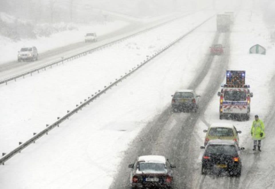 Un policier et des voitures en difficulté sur l'A31près de Thionville le 20 décembre 2010 – Photographie : AFP Jean-Christophe Verhaegen via liberation.fr