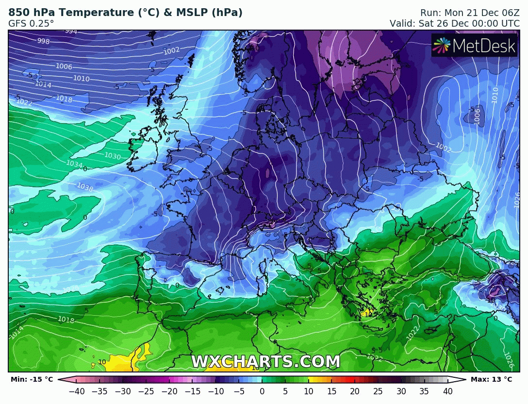 Animation des températures à 850 hPa du 25 au 31 décembre 2020 – Modèle GFS via WX CHARTS
