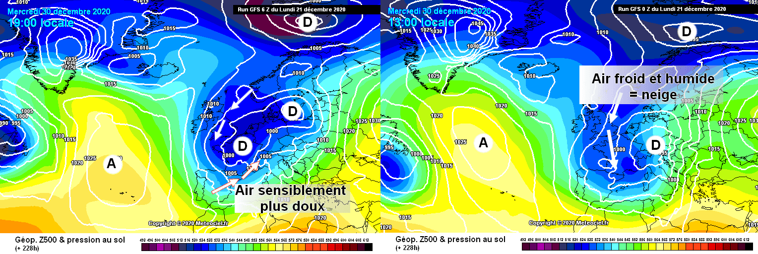Dans ce flux, les précipitations devraient se bloquer contre les reliefs du Nord du Massif-Central, du Nord des Alpes et entre les Vosges et le Jura alors que l’air froid s’infiltrera franchement sur ces régions. Ainsi, si les première précipitations neigeuses devraient se produire à partir de 900/1000m en journée de Jeudi sur les reliefs cités précédemment, cette limite pluie-neige devrait peu à peu s’abaisser entre le réveillon et vendredi 25 décembre.